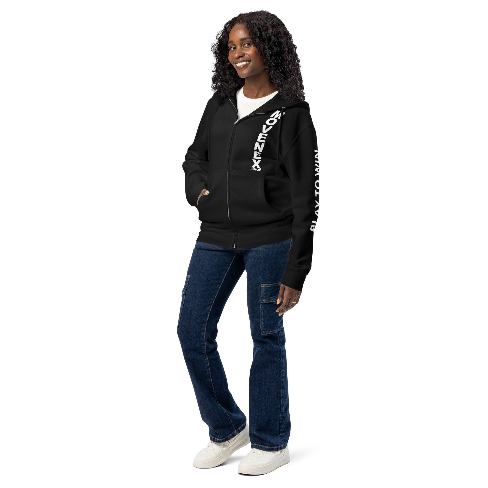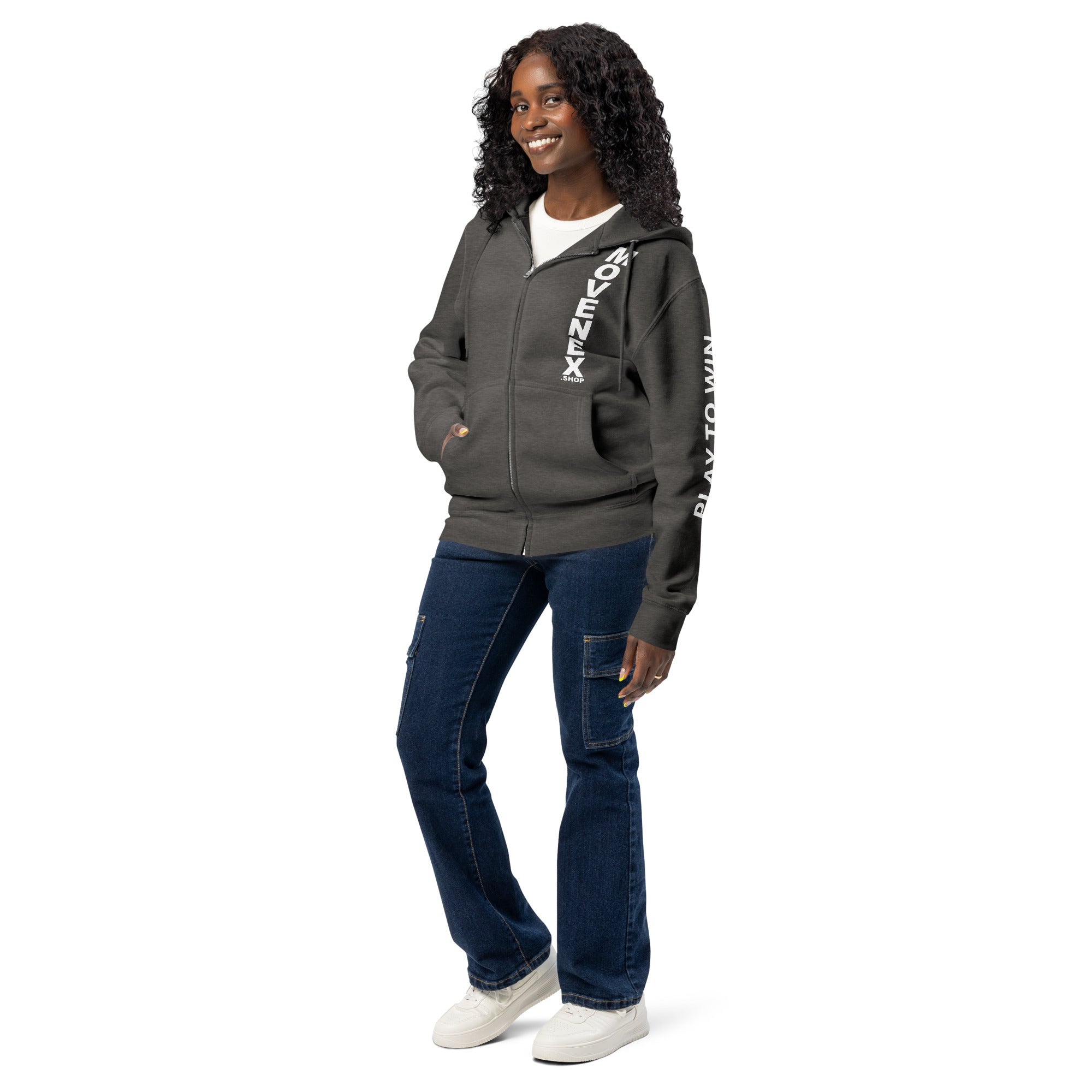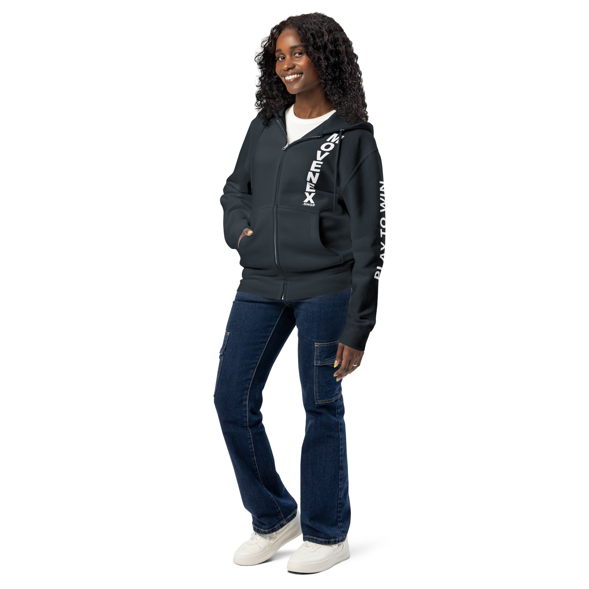 Sweat à capuche premium à fermeture éclair Movenex “Z68, Fitzroy“ "Play to Win" dans le dos et sur la manche gauche avec plusieurs choix de couleur : noir, bleu, bordeaux, rouge, beige, gris, gris foncé, vert, ... pour hommes et femmes.