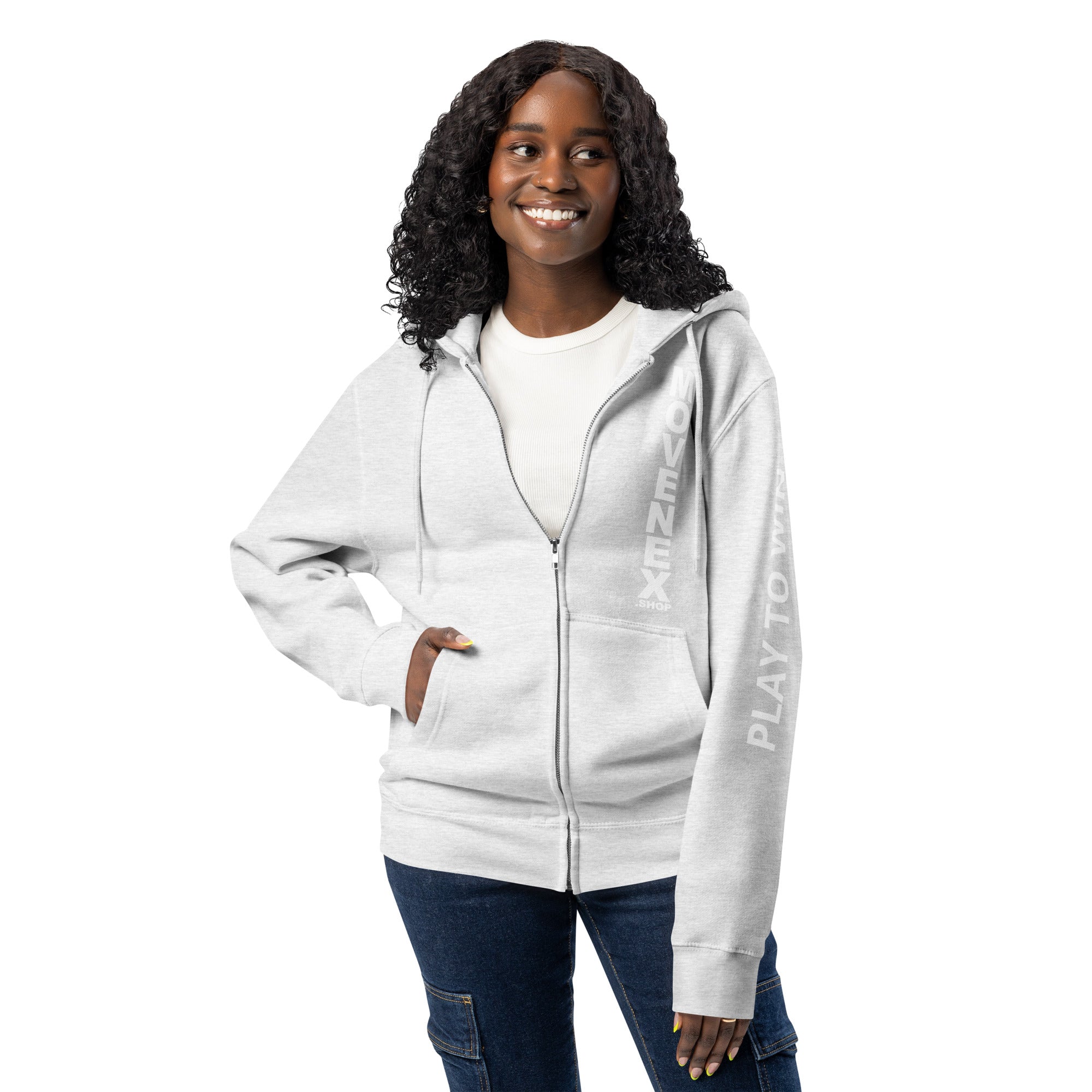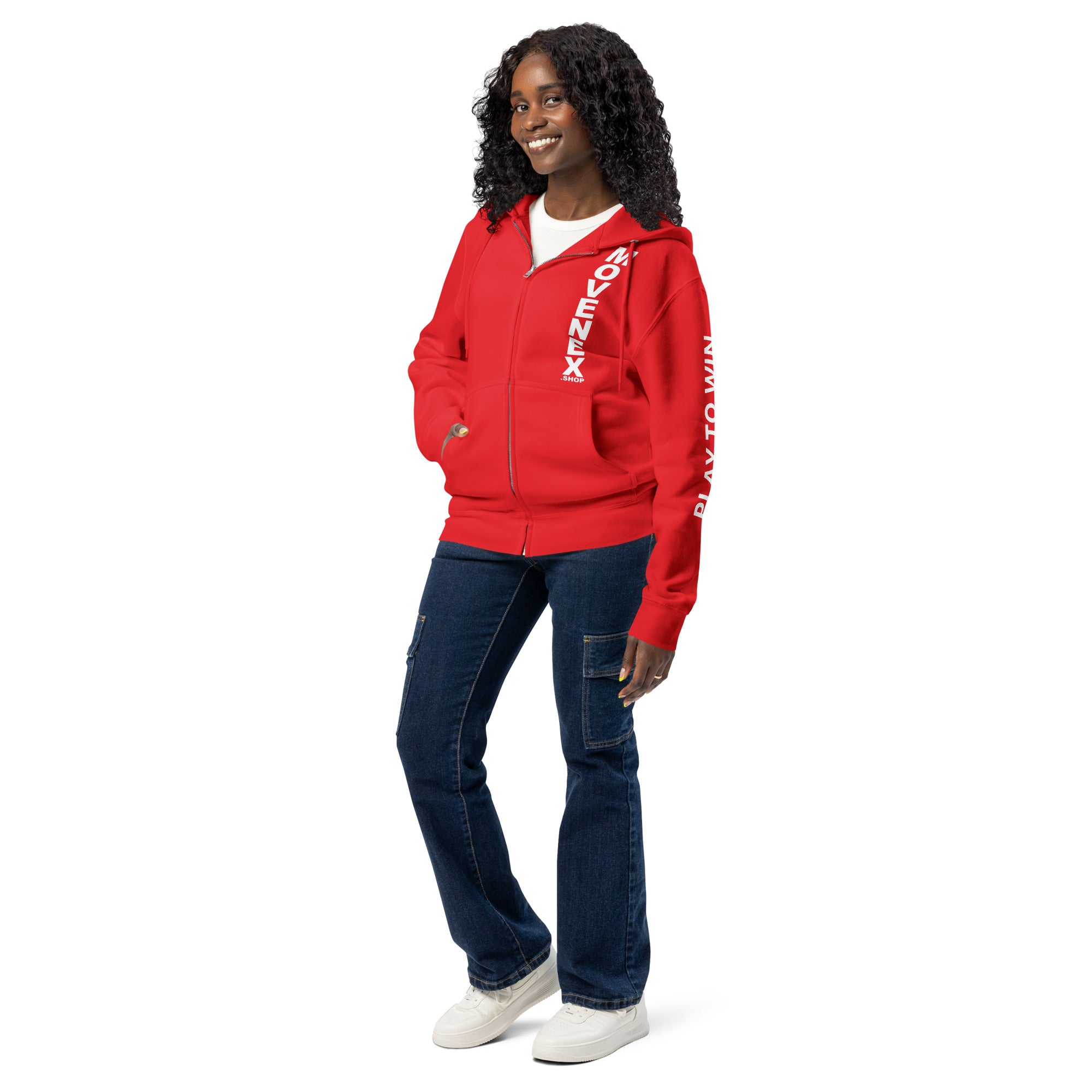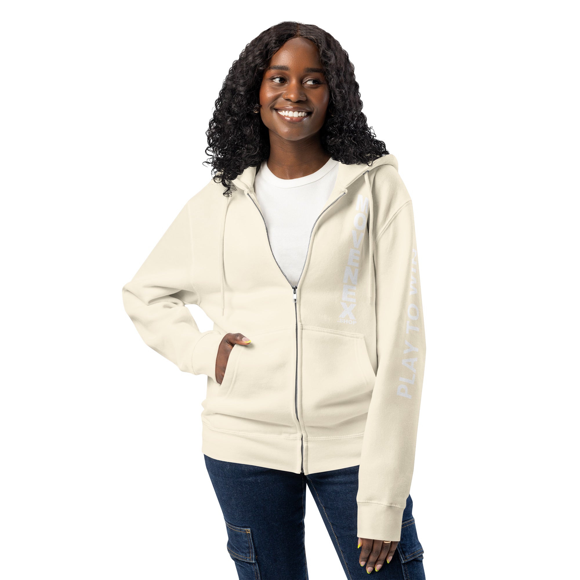 Sweat à capuche premium à fermeture éclair Movenex “Z68, Fitzroy“ "Play to Win" dans le dos et sur la manche gauche avec plusieurs choix de couleur : noir, bleu, bordeaux, rouge, beige, gris, gris foncé, vert, ... pour hommes et femmes.